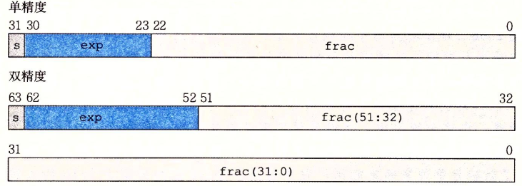 在单精度浮点格式中,$s$,exp,frac字段分别为1位,$k=8$位,$n=23$位;在双精度浮点格式中,$s$,exp,frac字段分别为1位,$k=11$位,$n=52$位。