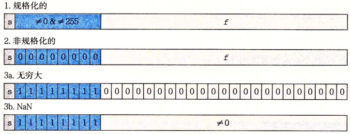 规格化的值: 当exp的位模式既不全为0,也不全为1的时候,称为规格化的值,阶码字段被解释为偏置(bias)形式表示的有符号整数,阶码的值为 $\mathbf{E=e-bias}$,其中 $e$ 是无符号数,其位表示为 $e_{k-1}\ldots e_1e_0$(1-254,1-2046),而bias是一个等于 $2^{k-1}-1$ (127,1023)的偏置值。 由此产生的指数取值范围对于单精度是 $[-126,127]$,对于双精度为 $[-1022,1023]$。