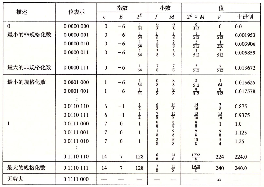假如我们有8位格式,阶码位 $k=4$ 位,尾数位 $n=3$ 位,则偏置量为 $2^{4-1}-1=7$,部分可能结果如下: