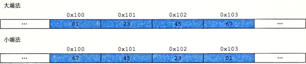 假设变量 $x$ 类型为int,位于地址0x100处,十六进制的值为0x01234567,下图表示两种方法排列表示的规则: