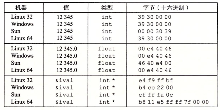 typedef unsigned char *byte_pointer; void show_bytes(byte_pointer start, size_t len) { size_t i; for (i = 0; i < len; i++) printf(" %.2x", start[i]); printf("\n"); } void show_int(int x) { show_bytes((byte_pointer) &x, sizeof(int)); } void show_float(float x) { show_bytes((byte_pointer) &x, sizeof(float)); } void show_pointer(void *x) { show_bytes((byte_pointer) &x, sizeof(void *)); } void test_show_bytes(int val) { int ival = val; float fval = (float) ival; int *pval = &ival; show_int(ival); show_float(fval); show_pointer(pval); }