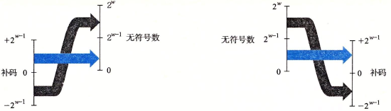 当 $u>\text{TMax}_w$ 时,$u$的最高位有效数字为1,转化为补码表示就相当于最高位权重从+1变为-1,因此少了 $2^w$,反之同理,越靠近0的负数映射为越大的无符号数。