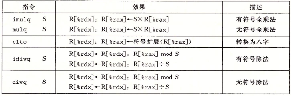 两个64位有符号或无符号整数相乘需要128位来表示,Intel把16字节的数称为 八字(oct word),下图为支持两个64位数字的全128位乘积和除法的指令:
