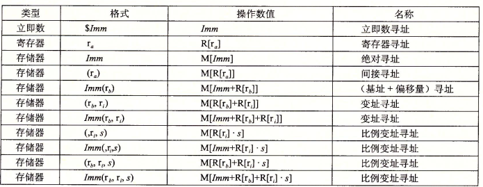 大多数指令有一个或多个 操作数(operand),指示出执行一个操作要使用的源数据值以及放置结果的目的为止。源数据值可以以常数形式给出,或是寄存器或内存中读出,结果可以存放在寄存器或者内存中。因此,操作数分为3种类型: