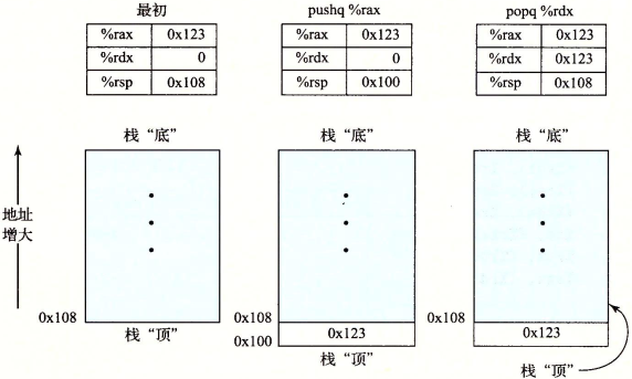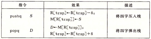 指令首先从栈顶位置读出数据,再将栈指针加8,等价于movq (%rsp), %rax addq $8, %rsp