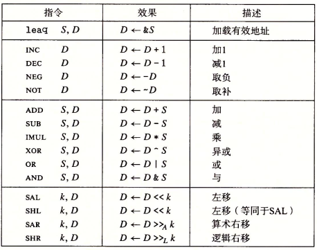 操作指令主要分为四组:加载有效地址、一元操作、二元操作和移位,如下图所示: