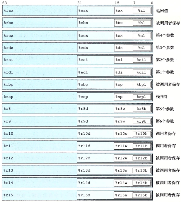 目前它们已经和过去的功能几乎毫无关系,只是保留了名字。新扩充的8个寄存器则命名为%r8到%r15。