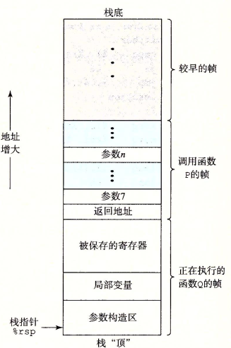 当x86-64过程需要的存储空间超过寄存器能存放的大小时,就会在栈上分配空间,这个部分称为过程的栈帧(stack frame)。上图中,当P调用Q时,会把返回地址压入栈中,指明当Q返回时要从程序的哪个位置继续执行,我们把这个返回地址当做P的栈帧的一部分,因为这是和P相关的状态。