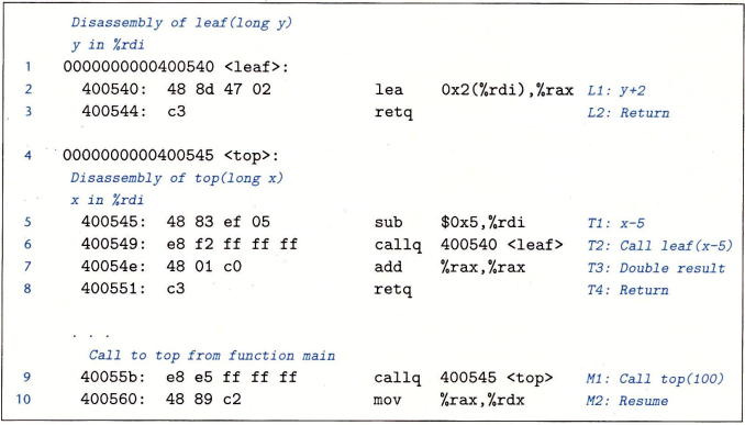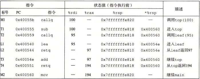 将控制从P转移到Q只需要简单地把程序计数器(PC)设置为Q的代码起始位置。不过,当稍后从Q返回时,处理器必须记录好它需要继续P的执行的代码的位置。这个信息是用指令call Q调用过程Q来记录的。该指令会把地址A压入栈中,并将PC设置为Q的起始地址。压入的地址A称为返回地址,是紧跟call后面的那条指令的地址。对应的指令ret会从栈中弹出A并把PC设置为A。