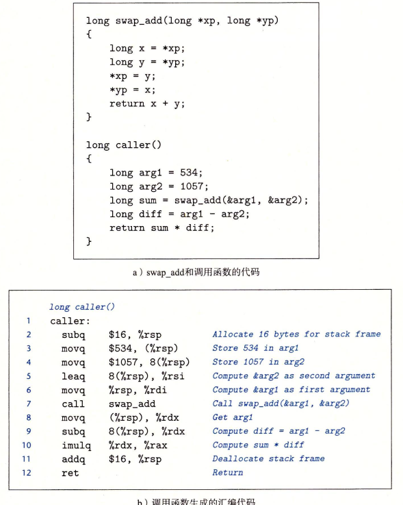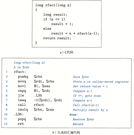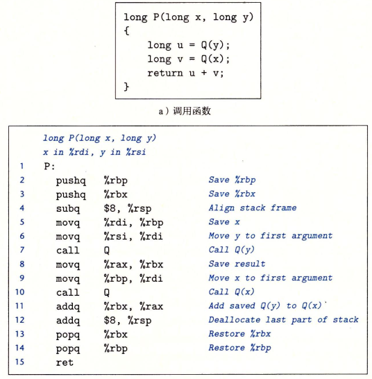 寄存器组是唯一被所有过程共享的资源,虽然在给定时刻只有一个过程是活动的,我们仍要保证一个过程调用另一个过程时,被调用者不会覆盖调用者稍后要使用的寄存器值。因此,根据惯例,寄存器%rbx,%rbp,$r12~%r15被划分为被调用者保存寄存器,当过程P调用过程Q时,Q必须保存这些寄存器的值,也就是说如果要用到它们,就要用pushq将原始值压入栈中,并在返回前从栈中弹出旧值。
