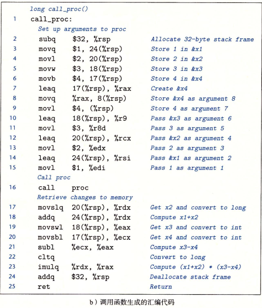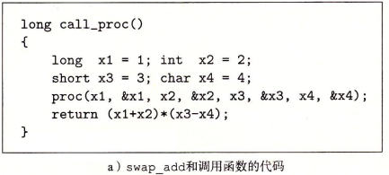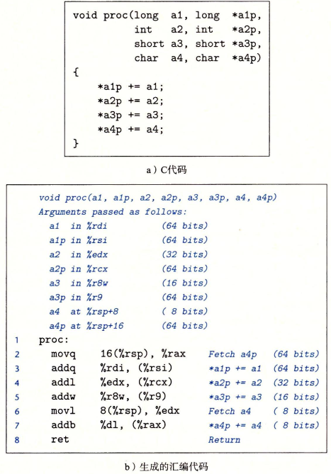 下面是参数传递的例子,可以看到最后两个参数位于相对于栈指针距离为8和16的位置。注意:第6行movl从内存读入4字节,而后面的addb指令只是用其中的低位1字节。(因为它重置了存储a2的寄存器),另外这里也没有做扩展,因为它只是读取,不涉及再做转换,与2.1节的练习不同。
